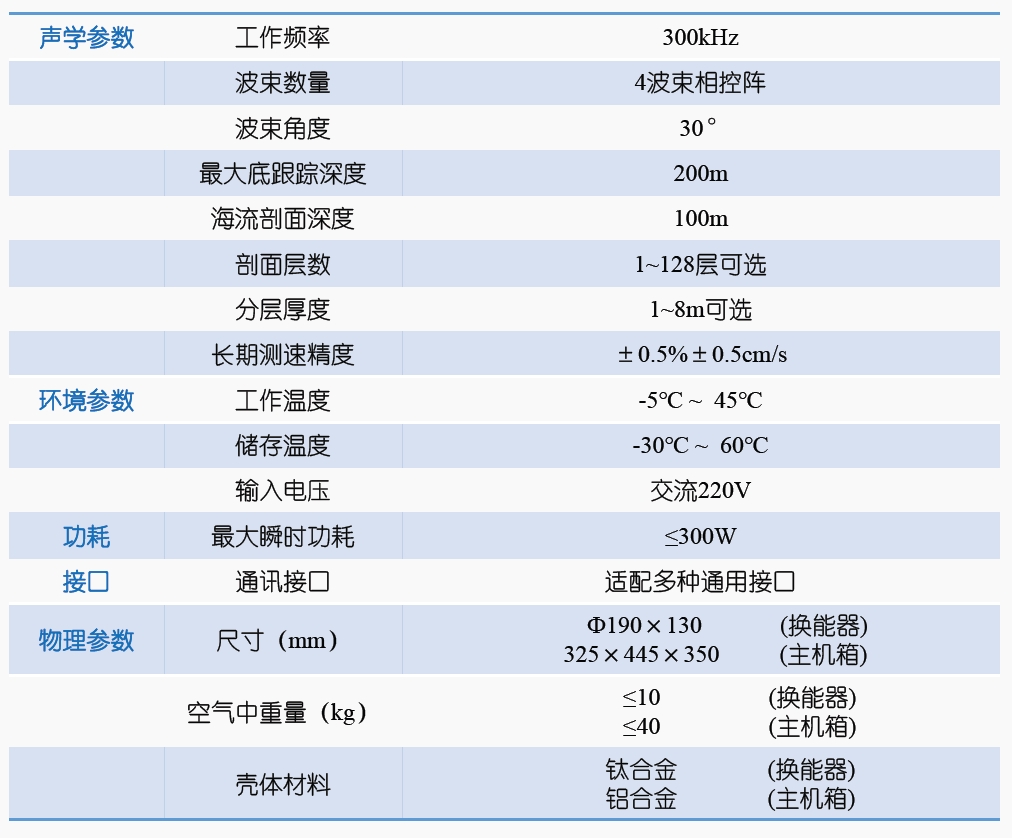 多普勒海流剖面儀為分體式結構設計,具有測速精度高、適裝性強、易維護等特點, 并可根據用戶需求適應多種通用通訊接口, 廣泛應用于各類海洋工程。